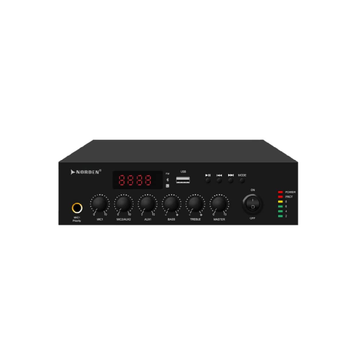 The NVS-90230251MA is 1.5U Mini Digital Mixer Amplifier with inbuilt USB/FM and Bluetooth. Both 70V/100V and 4-16 Ω speaker outputs are available. The product has one AUX output and two AUX inputs. It also has two MIC inputs. The MIC1 is 6.3mm jack in front panel and MIC2 is XLR port in rear panel. It has separate volume control for each MIC and Aux input, also have Bass and Treble control.