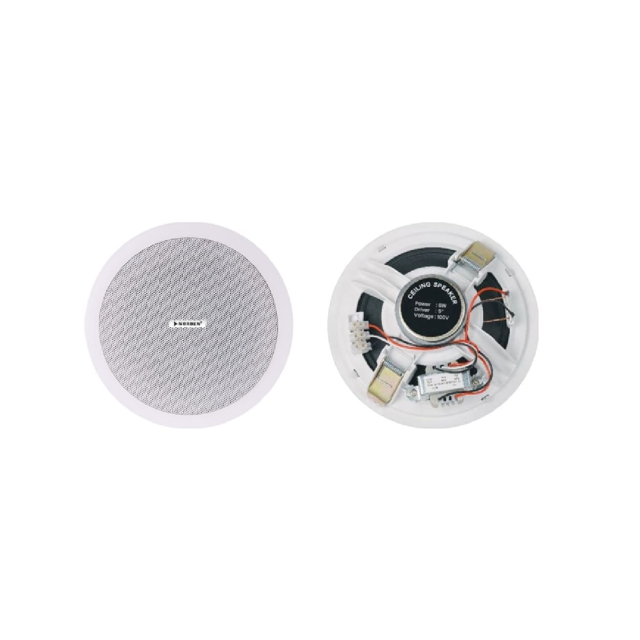NVS-L1001006CS is a Ceiling mount speaker with built in 100V transformer. This speaker has the most pop modern and easy fitting method. It sets new standards in security and easiness with a quick fastening clasp. The installation frame is made of high quality plastic ABS housing and grille of coated steel. The construction is burgle proof and impact resistant.