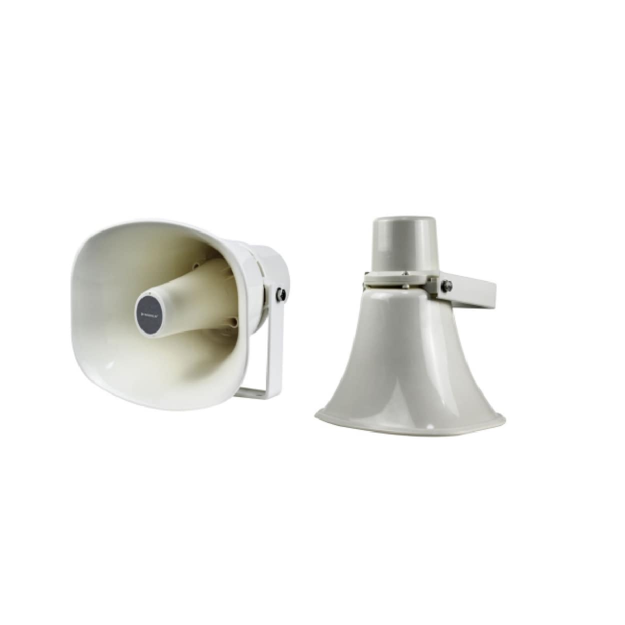 The NVS-EN15HN is an EN54-24 certified outdoor horn loudspeaker designed for voice alarm and paging applications in schools, offices, hotels, and airports. It provides power taps of 15W, 7.5W, 3.75W, and 1.9W with an 8Ω bypass, supporting 100V/70V line input via cable tail. Built with a junction box, ceramic connector, 95℃ fire-resistant cable, and thermal fuse, it ensures maximum safety, while its IP66-rated ABS enclosure, stainless aluminum bracket, and white finish deliver durability in harsh outdoor conditions. The stainless mounting bracket allows quick, secure installation.